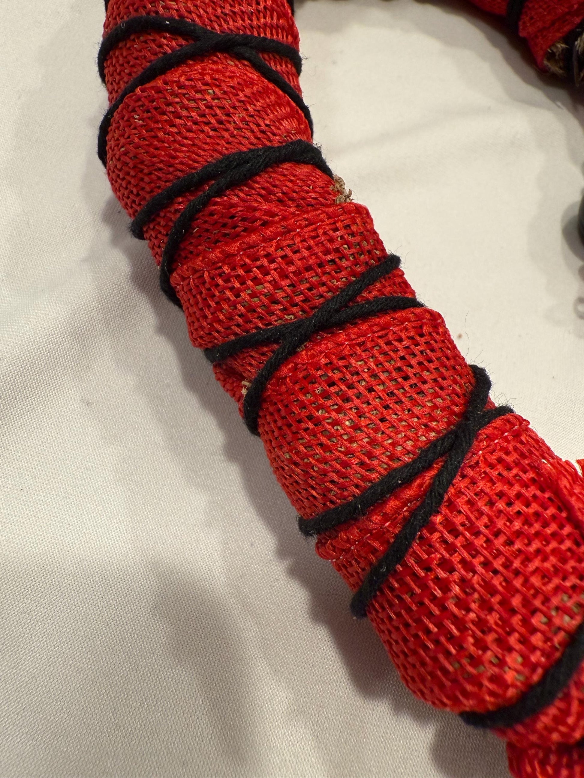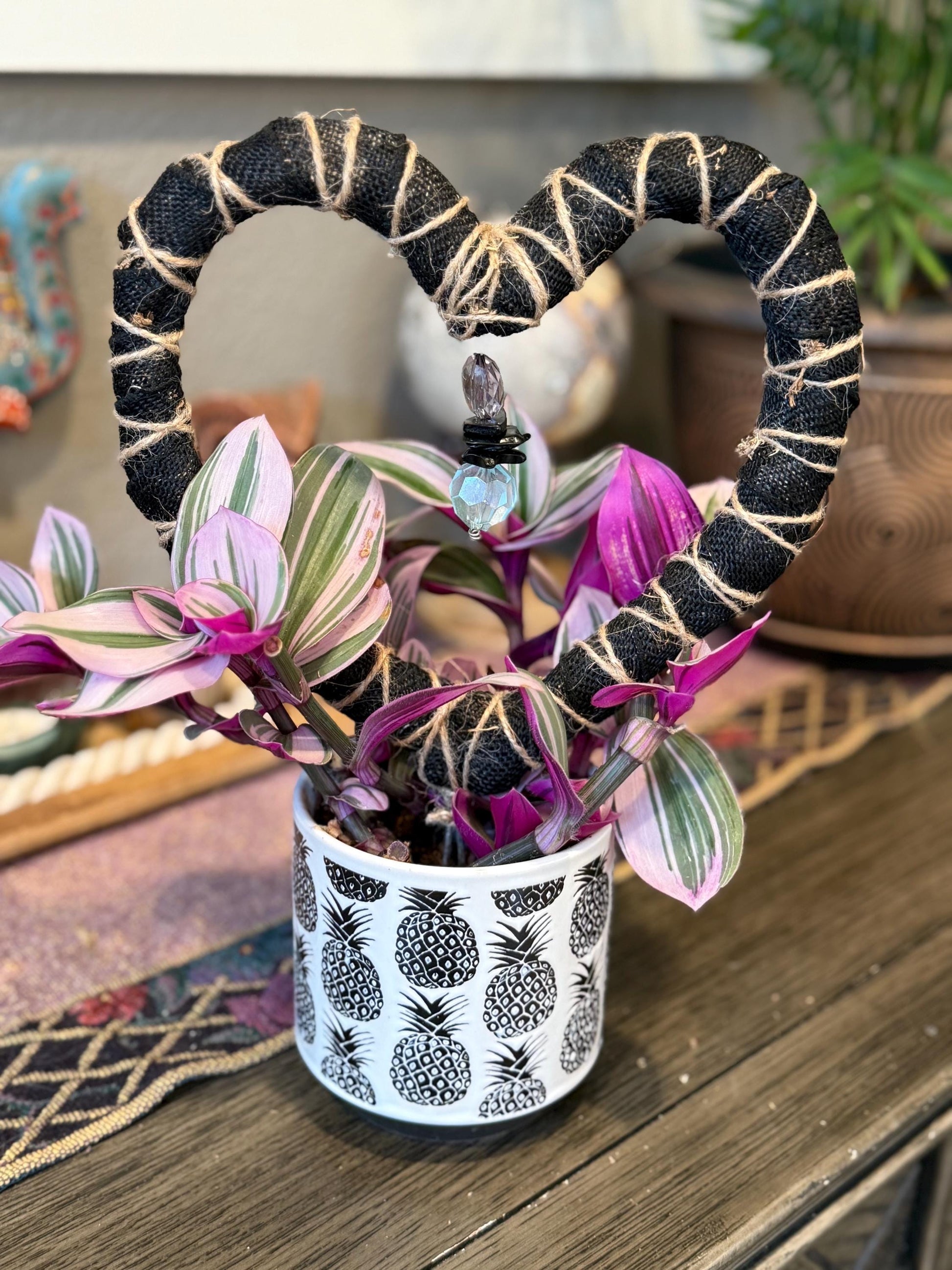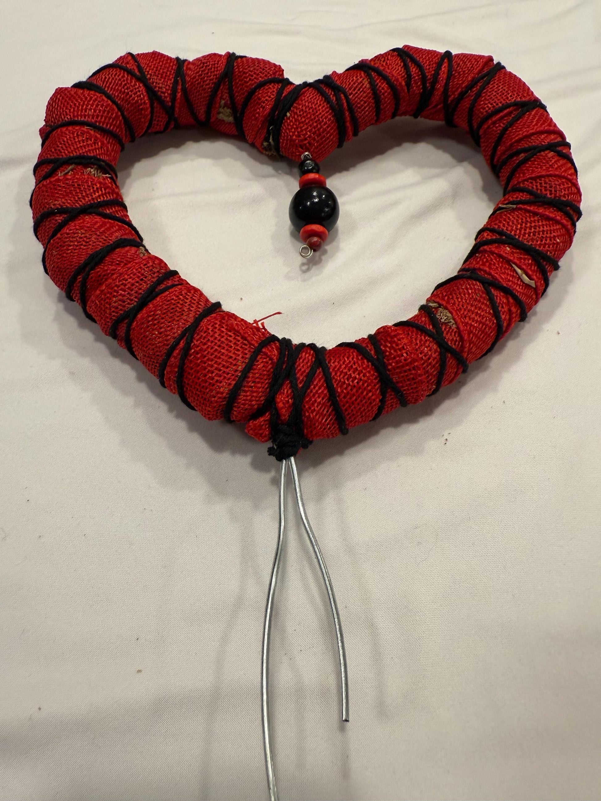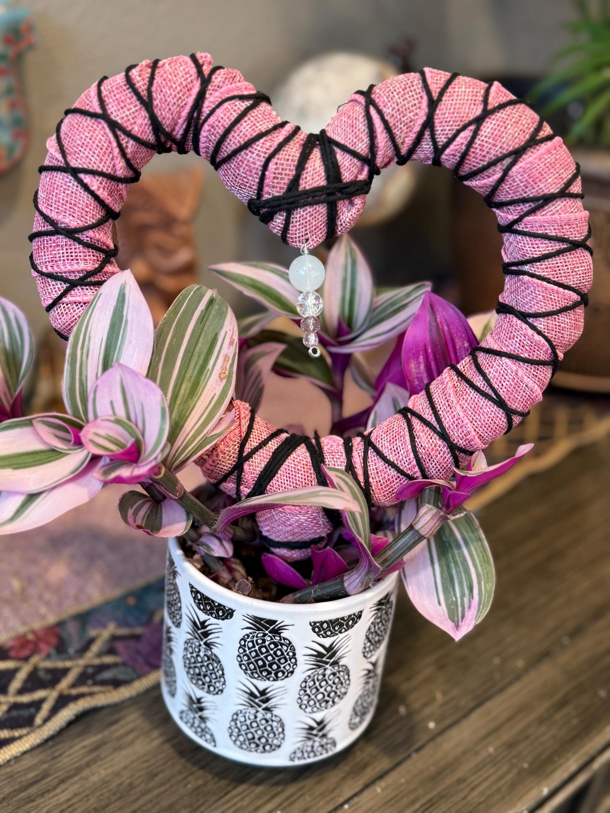 Each Heart pole I make is about 9 inches by 9 inches, depending on how you like it adjusted. Made from galvanized steel, burlap and twine. The core is long fibered sphagnum moss. The exposed stake is about 3-4 inches long and can be cut or adjusted by bending to fit your specific pot.